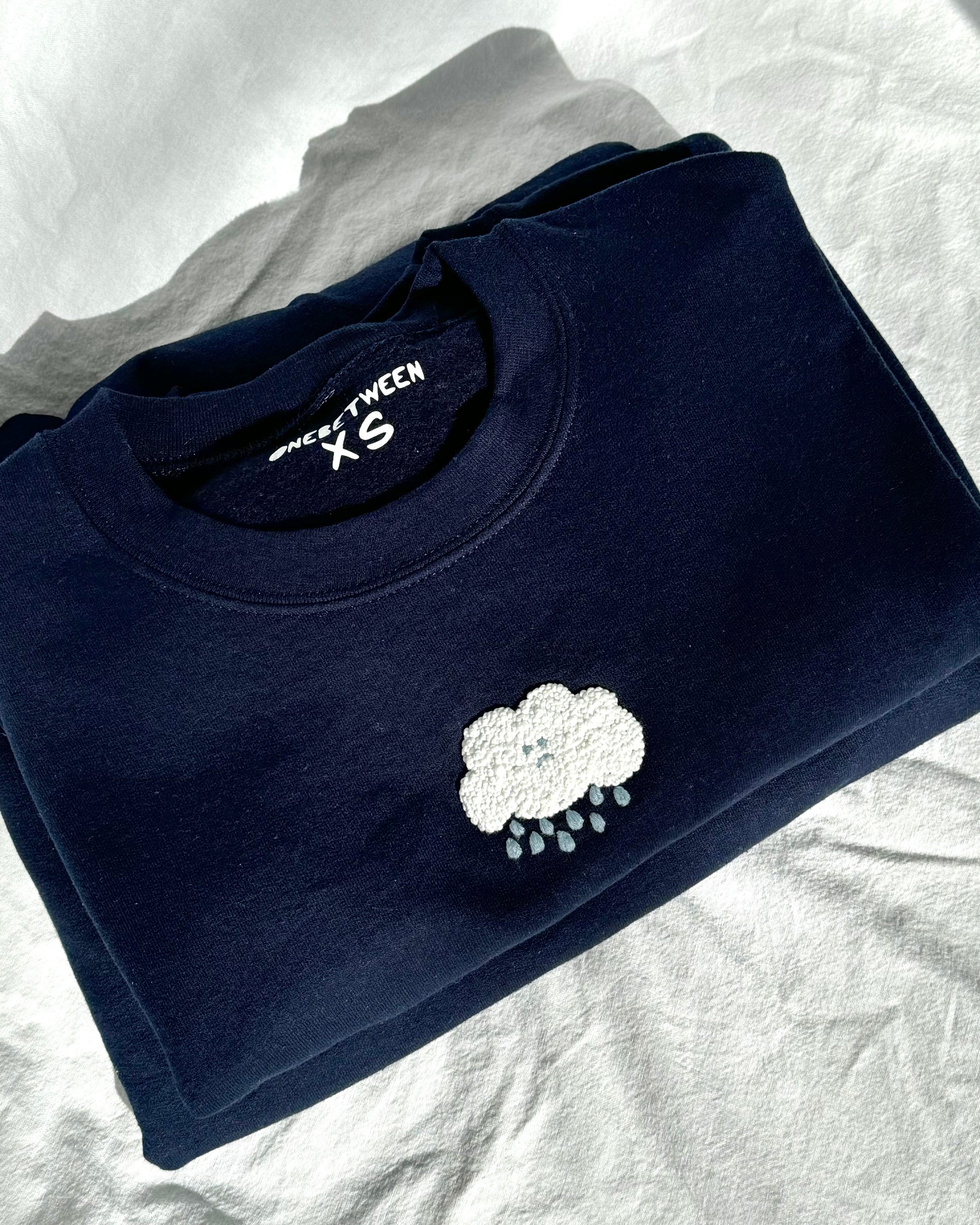 dark navy sweatshirt: french knot sad rain cloud on the front, french knot yellow lighting bolt on the left sleeve.