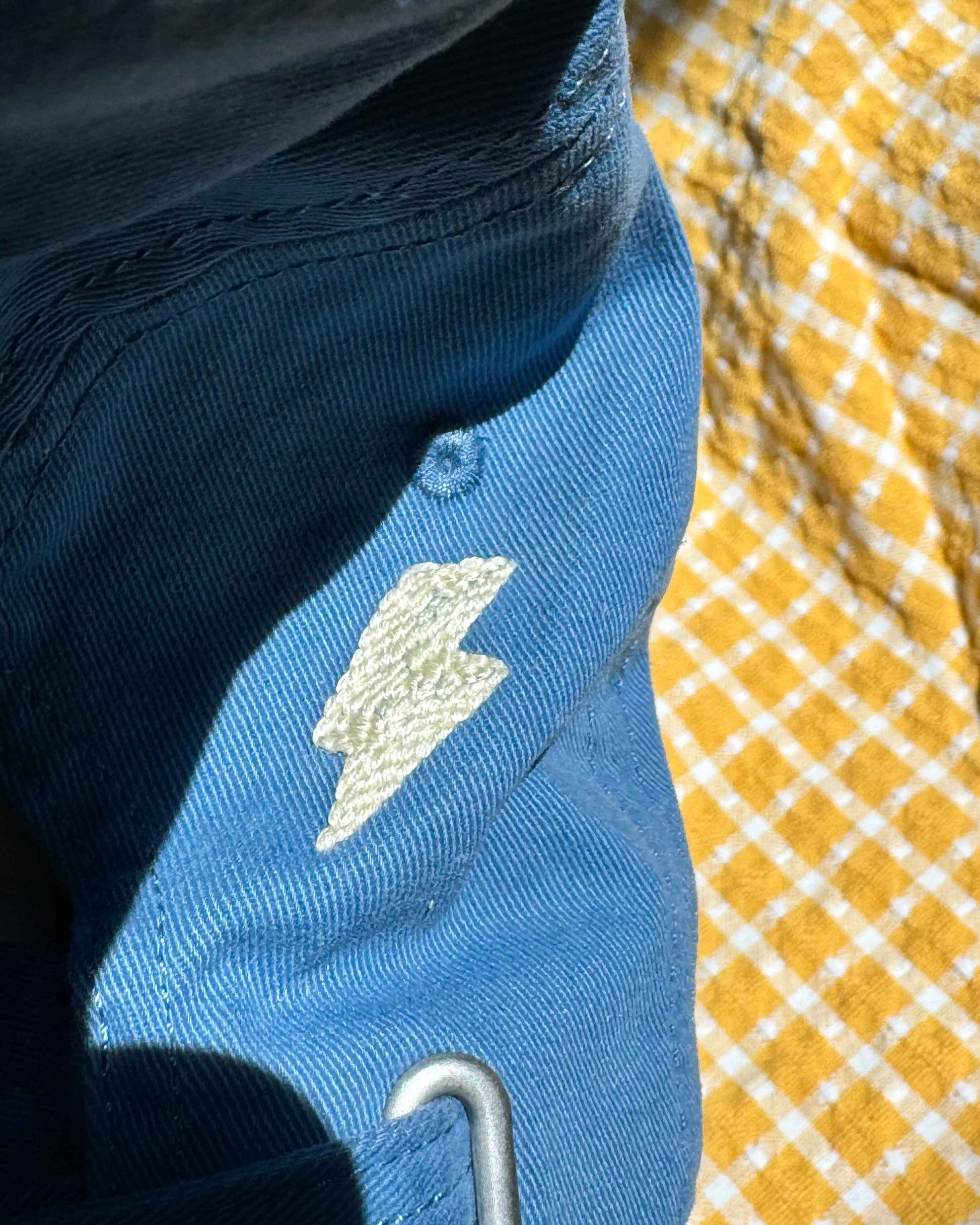 Blue hat: French knot sad cloud, embroidered lighting bolt on the back.