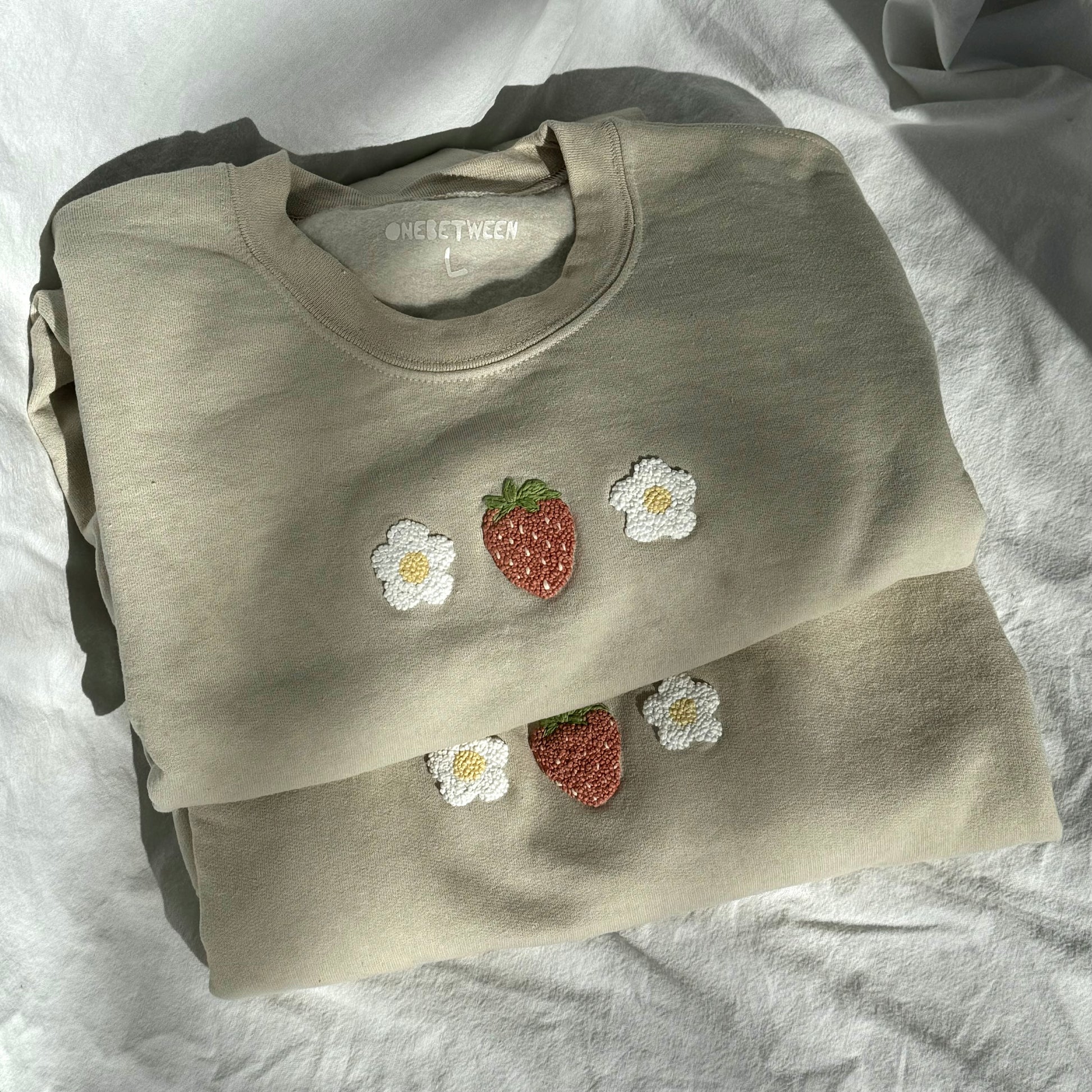 sand (beige) sweatshirt: french knot strawberry between 2 flowers, an outline of a strawberry on left sleeve.